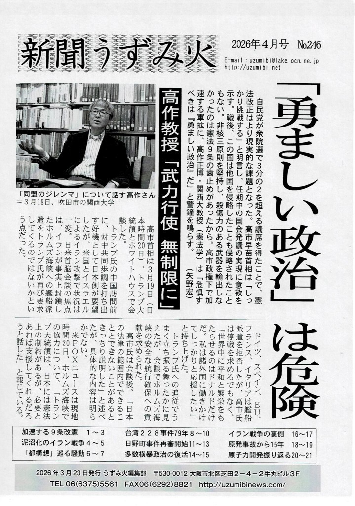 自民党が衆院選で3分の2を超える議席を得たことで、憲法改正はより現実的な課題となった。高市早苗首相は「しっかり挑戦する」と明言し、任期中の国会発議の実現に意欲を示す。戦後、この国は他国を侵略したことも侵略されたこともない。非核三原則を堅持し、殺傷力のある武器を輸出しなかったのは憲法9条の歯止めがあったから。高市政権下で加速する軍拡に、高作正博・関西大教授(憲法学)は「危惧すべきは『勇ましい政治』だ」と警鐘を鳴らす。